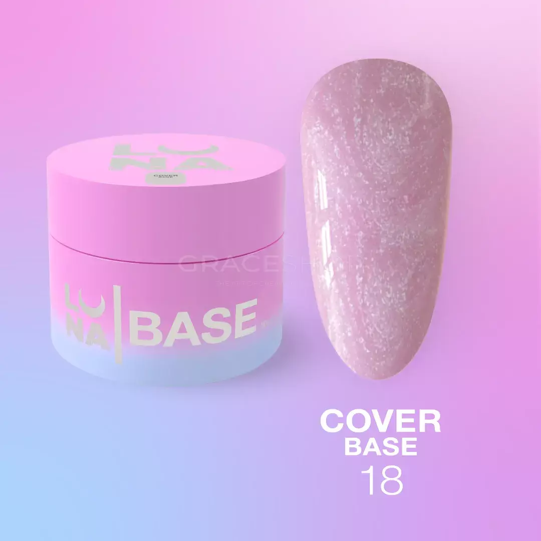 Cover Base №18— це камуфлююча база ніжного-рожевого кольору з блискітками. Ця колекція відмінно розподіляється по нігтях та утворює красивий відблиск. Вона красиво виглядає в глянцевому варіанті, а ще цікавіше в матовому.