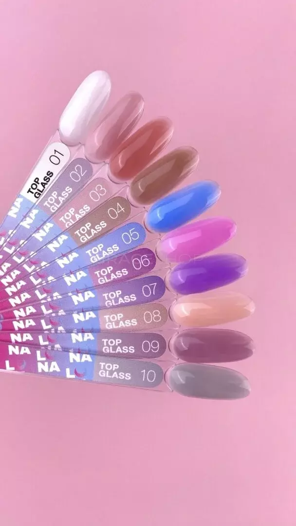 TOP GLASS — colored tops without a sticky layer that retain shine for up to 4 weeks. They can be used in combination with other coatings to create interesting designs, and thanks to the color shade, separately for a trendy manicure.