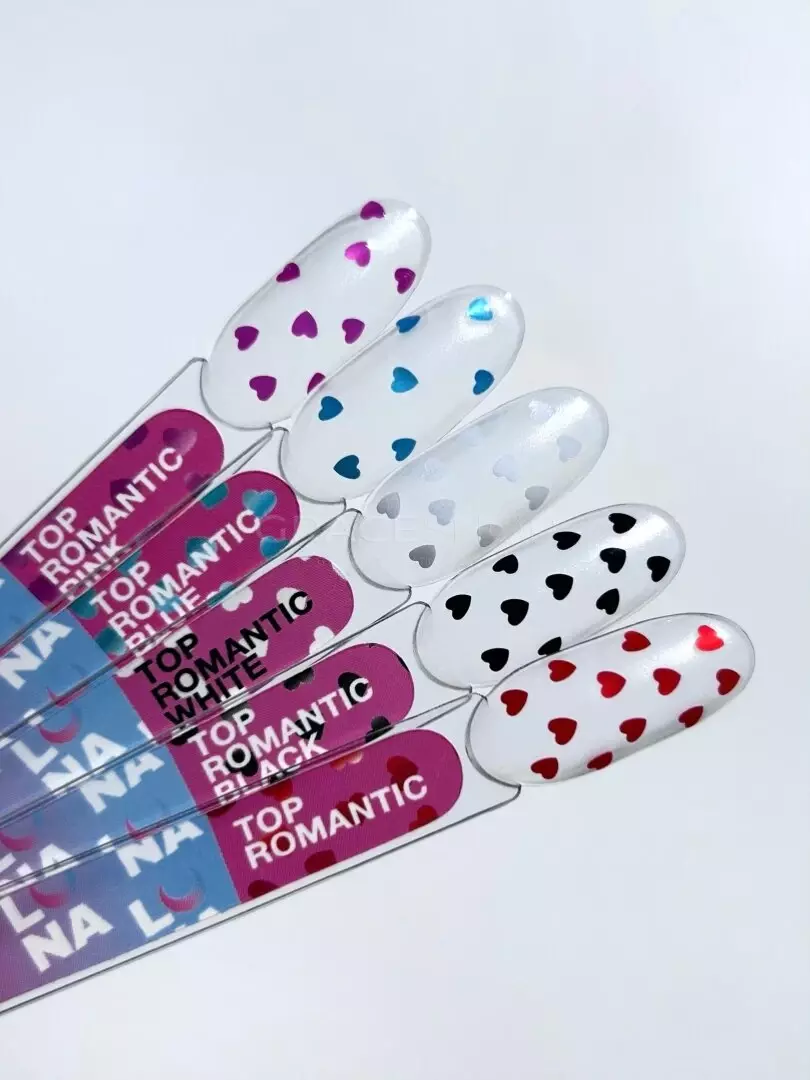 Top Romantic is a top with hearts, without a sticky layer, which will look harmonious with any color on the nails. It can make your manicure interesting and unusual.